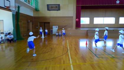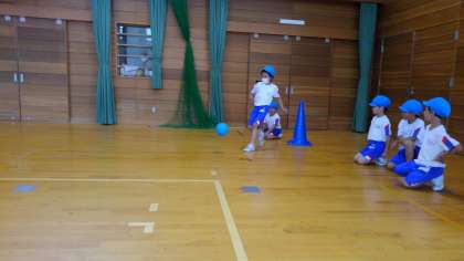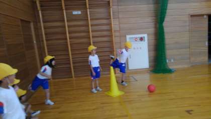 キックベース遊びでは、転がってきたボールをおもいっきり蹴ることができました。