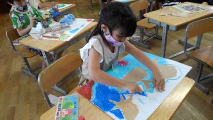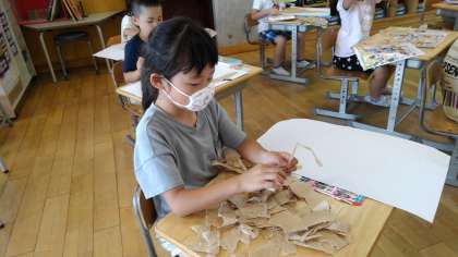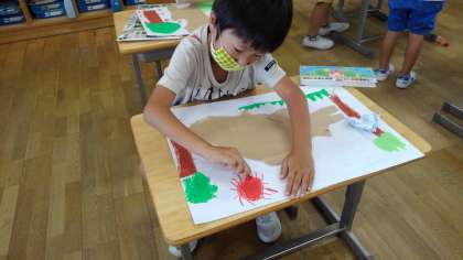 ちぎった紙の形からいろいろな世界を想像して、絵を描きました。