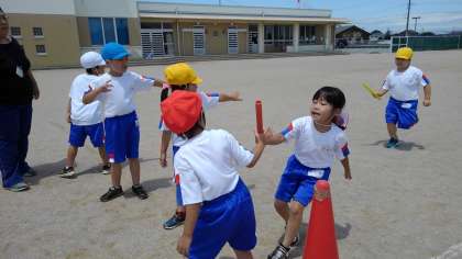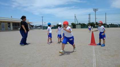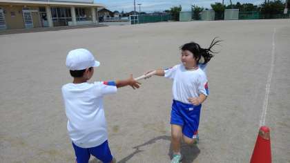 リレー遊びでは、上手にバトンパスが上手になるよう友達同士声を掛け合っています。