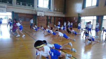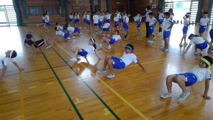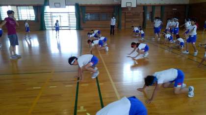 マット運動の準備体操として、いろいろな動物歩きに挑戦しています。