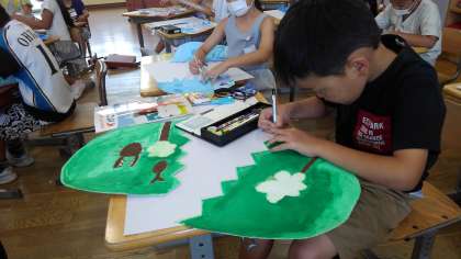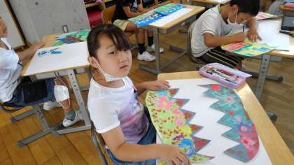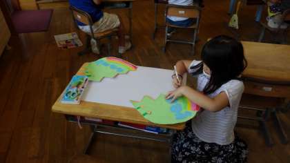 たまごから飛び出した絵を描いています。色鮮やかなたまごから何が飛び出すか楽しみです。