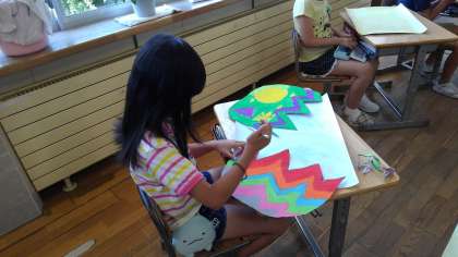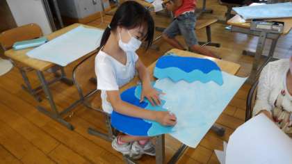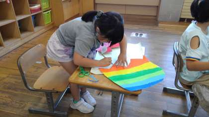 たまごから飛び出した絵を描いています。カラフルなたまごがいっぱいです。