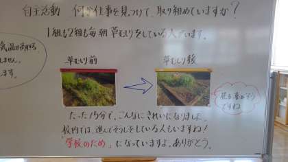 先生からの朝の活動へのメッセージです。朝の活動をとても頑張っている4年生です。