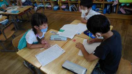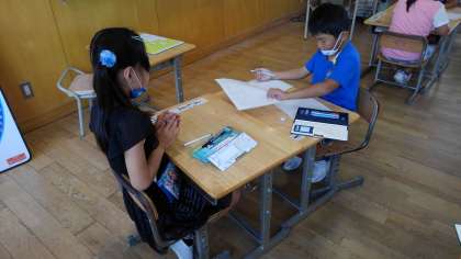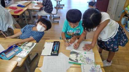 ペアでしりとり遊びをしました。思い浮かばない言葉にそっとアドバイスする姿が見られます。