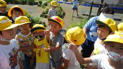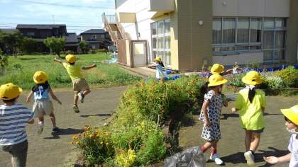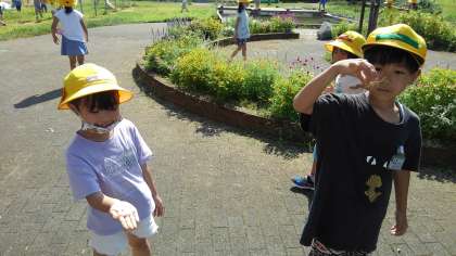 花壇やビオトープで生き物を探しました。バッタやチョウを見つけ、大喜びでした。
