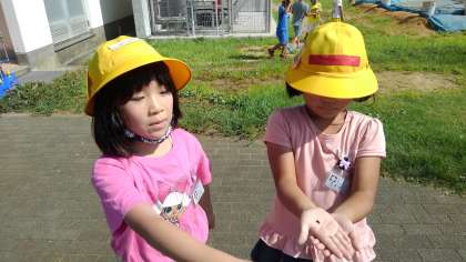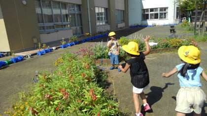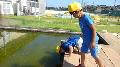池の中をのぞいたり、チョウをジャンプして捕まえたりして、楽しく活動しています。