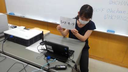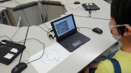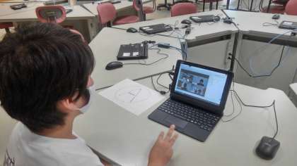 コンピューター室でオンライン授業を試しています。