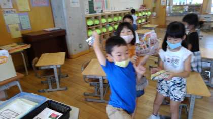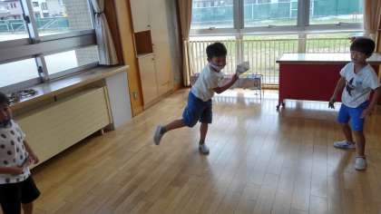 出来上がった紙鉄砲で音を鳴らしました。最初なかなか鳴らなかった音が、上手に腕を振れるようになると、いい音が鳴り始めました。みんなとても喜んでいました。