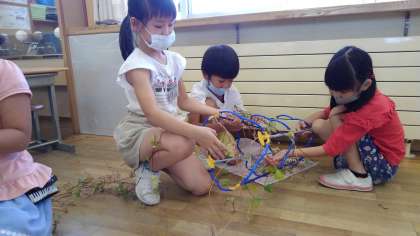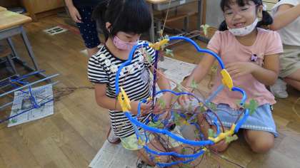 つるが支柱に絡まって、なかなか取れません。友達と協力して取り組んでいます。