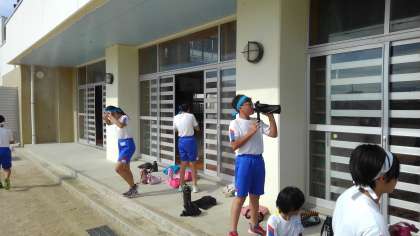 リレーの練習では、各団でバトンパスのリードの歩数を調整したり、受け手のもらい方をアドバイスし合ったりしています。