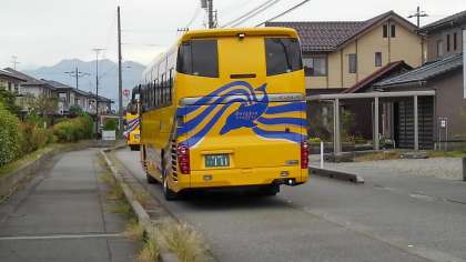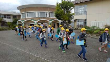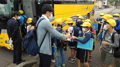 4年生が魚津水族館と県水産研究所へ社会見学に出発しました。出発前に、しっかり消毒。