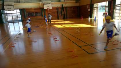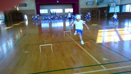 障害走リレーでは、ミニハードルやケンパを使ってリレーをしました。リズムよく飛んで走れるようになりました。