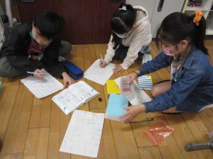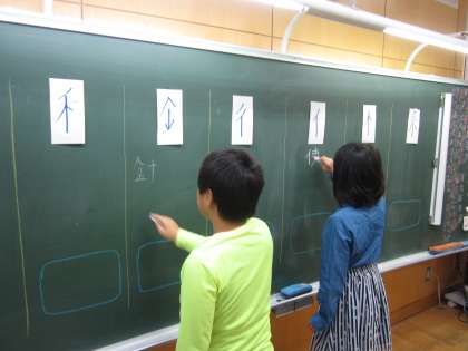 「へんとつくり」の学習をしています。「へん」ごとのチームに分かれて、たくさん漢字を見付けています。