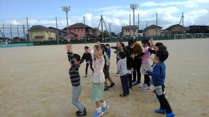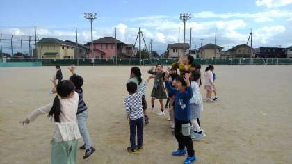 空に浮かぶくじらぐもを見つけた子供たち。思わずグラウンドに出て、くじらぐもに声をかけています。