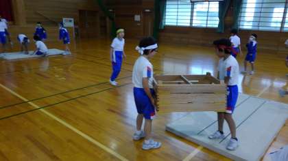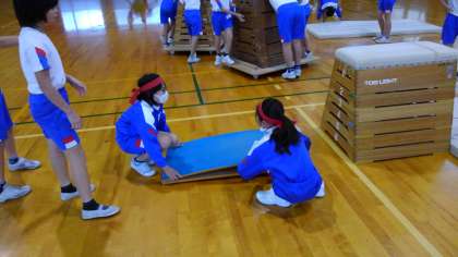 跳び箱の学習を始めます。安全に気を付けて、友達と協力して準備を進めています。
