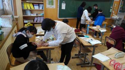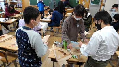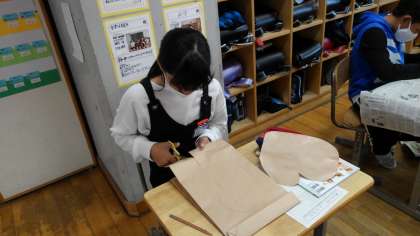 裁縫の学習では、布を使った家庭で役に立つものを作ります。まずは、型紙の作成です。