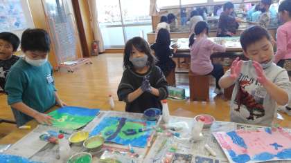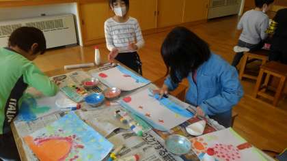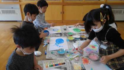 手のひらにおもいっきり絵の具を付けて、画用紙いっぱいに絵を描きました。