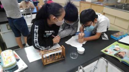 空気の体積の変化についての実験をしています。息を吹き掛けたり、試験管を握りしめたりしてシャボンの膜が持ち上がるか調べました。