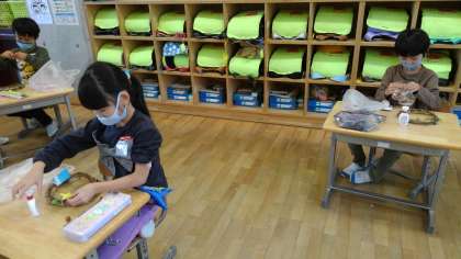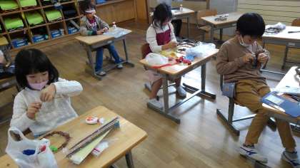 家からモールやリボン等を持ってきて、自分だけのすてきなリース作りに取り組んでいます。