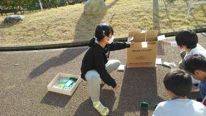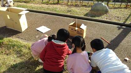 日光を鏡を使って反射させて集め、温度がどのくらい上がるか実験しました。3枚集めると、30℃近くになりました。