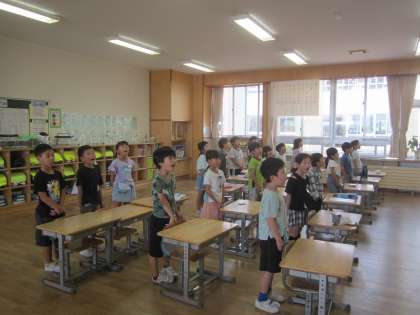 1年生教室から元気な歌声が聞こえてきました。朝の会で今月の歌を歌っています。しっかり覚えて、伸びやかに歌っていました。笑顔で歌うと声も伸びやかになるとよく言われますが、本当にその通りだと感じました。