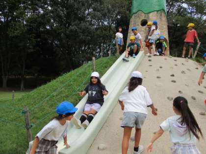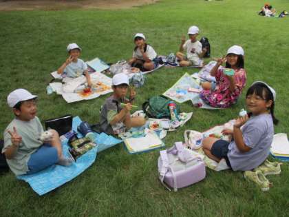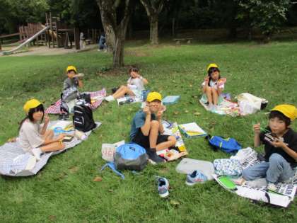 班活動のときから「お弁当、まだ?」「お腹すいた〜」と、何よりも楽しみにしていたお弁当タイム。お弁当箱をのぞかせてもらうと、どれも手の込んだおいしそうなお弁当。とびきりの笑顔がこぼれていました。お弁当の後は、芝生広場で楽しく遊びました。