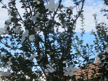 玄関前にあるムクゲが花を咲かせています。夏の時期に咲く印象がありましたが、花をたくさん付けていて見頃です。
