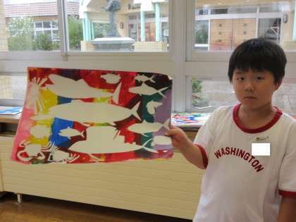 教室をまわっていると、2年生の子供たちが図工でつくった作品を見せてくれました。色彩ゆたかな素敵な作品ばかりです。