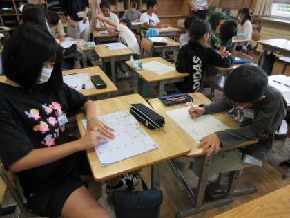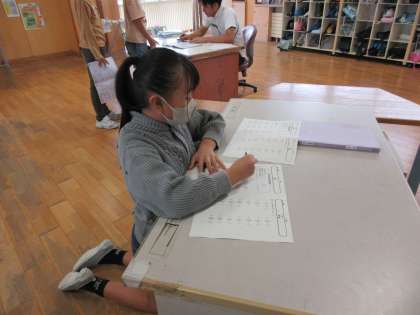 分数の学習です。ドリルが終わったらワークシートに取り組んで自分で採点をするなど、自分の進度で学習を進めています。友達や先生に聞きながらがんばっています。