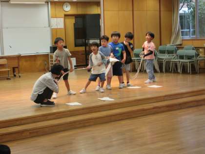 ランチルームで「大きなかぶ」の練習をしました。かぶを引っ張る動きやかけ声、歌など、気持ちを合わせて練習しました。
