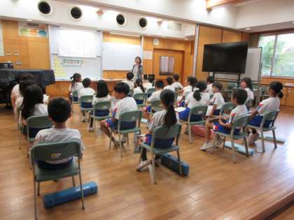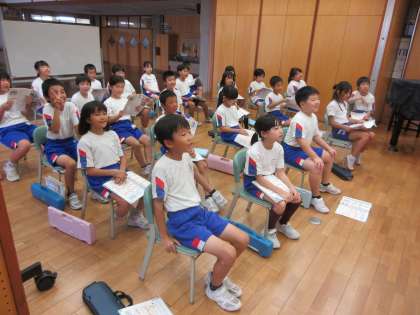 「かねがなる」の曲を歌い、旋律やリズムが繰り返されるおもしろさを味わいました。