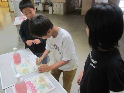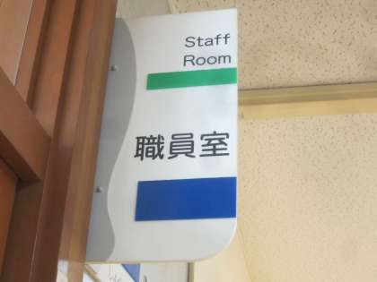 身の回りにあるアルファベットを探しています。学校のいろいろなお部屋の名前も英語で表記されていることを見つけました。