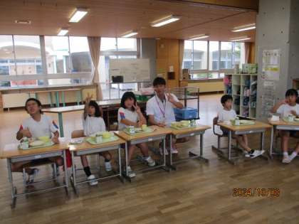 インターンの先生が2年生の教室に来てくれました。一緒に楽しく給食をいただきました。