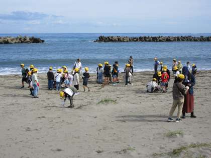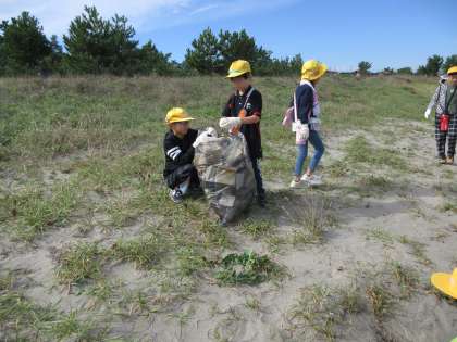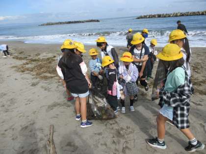 今日は天候に恵まれたため、大村海岸清掃を実施しました。にこにこグループごとに海岸まで歩き、砂浜の清掃をしました。ペットボトルや発泡スチロール、日用品など、様々なものが落ちていました。子供たちのがんばりのおかげで、砂浜がきれいになりました。