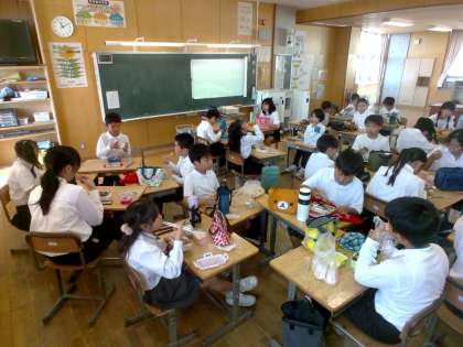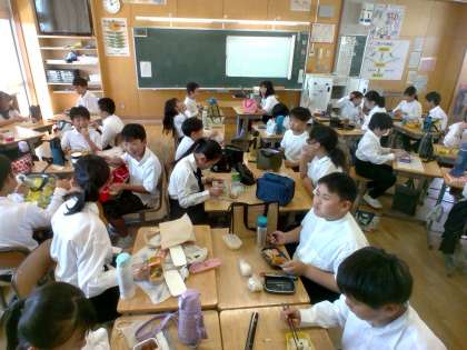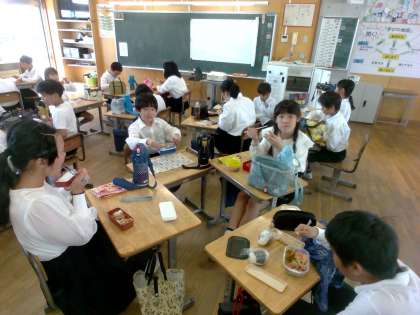 みんなでお弁当を食べています。うれしそうですね。