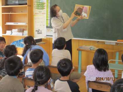 今日は、富山市立図書館の大広田分館から2名の方が来られ、本の紹介や素敵なお話を聞かせていただきました。おもしろそうな本を教えていただき、本への関心が強くなったようです。