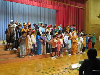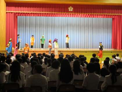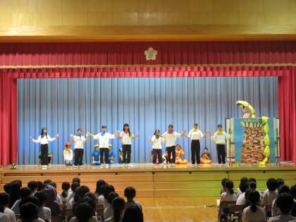 自分たちで作り上げた劇を発表しました。手作りの衣装や背景、小道具など、子供たちの工夫が感じられる作品に仕上がっています。