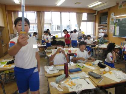 4年生フロアに、ポン!ポン!と音が響いていました。教材を使って空気の性質を学習しています。