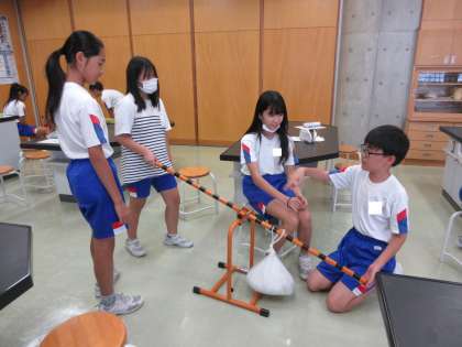 てこの実験です。おもりの位置を変えると、加える力が変化することを実感しました。