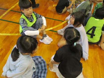 体育館では、みんなで「猛獣狩り」のゲームをしました。グループになった人たちと自己紹介をしたり、じゃんけんをしたりして楽しく過ごしました。