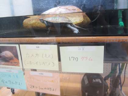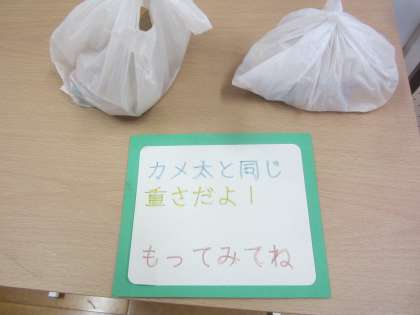 カメ太です。体の重さは170グラム。カメ太の体の重さが体感できるようになっています。