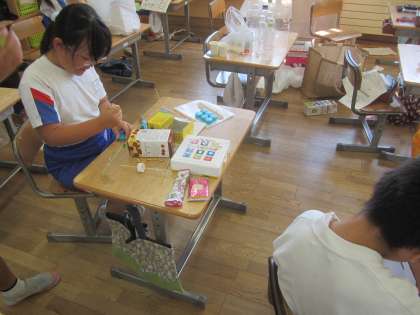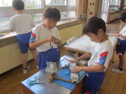 うごくおもちゃづくりをしています。転がしたり、とばしたり、ゴムの力を使ったり、教科書を参考に作っています。