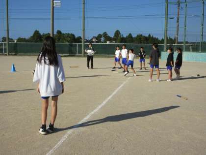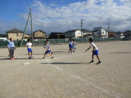 ベースボール型のゲームです。励まし合ったりアドバイスをしたりと、チームの団結が少しずつ高まっているようです。