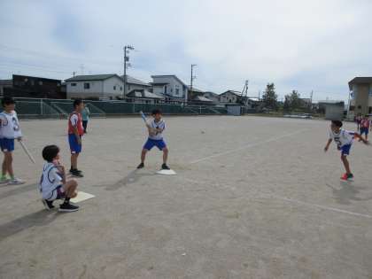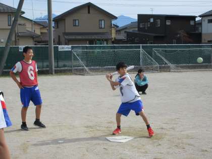 ベースボール型のゲームです。チームで励まし合ったりアドバイスし合ったりして、ゲームを進めました。ヒットを打った仲間がいると、自分のことのように喜び合う姿が素敵でした。