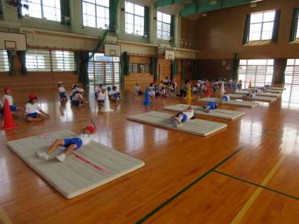 マット運動です。「えんぴつ」や「ゆりかご」で基本的な動きを楽しみました。
