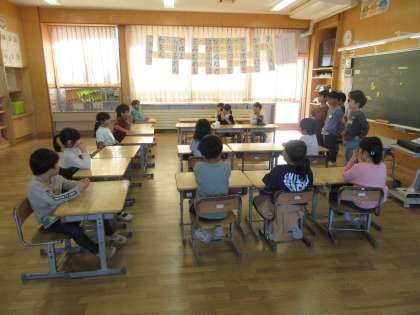 1年生は係のイベントの後の振り返りです。お互いのがんばったところや楽しかったことを伝えあいました。