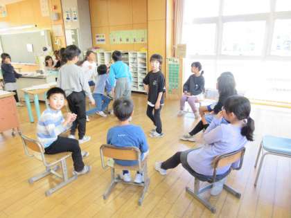 2年生がフルーツバスケットをしていました。座れなかったら、かわいいシールを貼ってもらっていました。