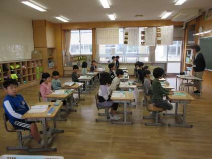 教科書やノート、算数ブロックを整えて、しっかり始まりのあいさつをしていました。
