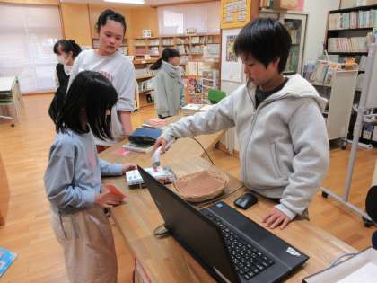 休み時間にも本を借りに来る子供をよく見かけます。図書委員も仕事に責任をもって貸出作業をしています。