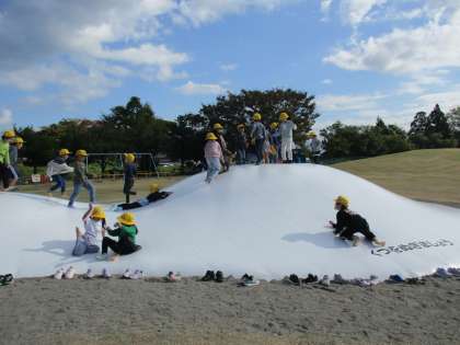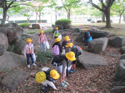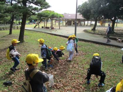 みんなで、安全に気を付けながら歩いていきました。公園では、どんぐりをひろったり落ち葉で遊んだりして、秋みつけをしました。遊具でも元気に遊んできました。
